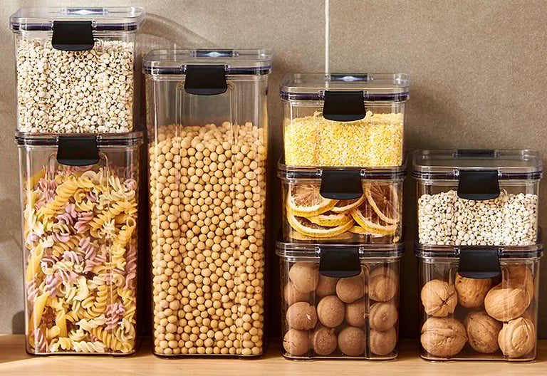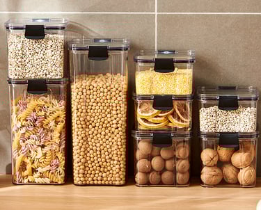 These transparent food storage containers keep your grains, pasta, nuts, etc. organized. With secure - locking lids, they prevent spills and keep contents fresh. Ideal for kitchen use, making storage neat and accessible.